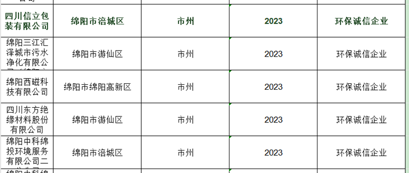 近日,从绵阳市生态环境局发布的关于《绵阳市2023年度市级企业环境信用评价结果公告》中获悉,四川信立包装有限公司获评绵阳市2023年度“环保诚信企业”。